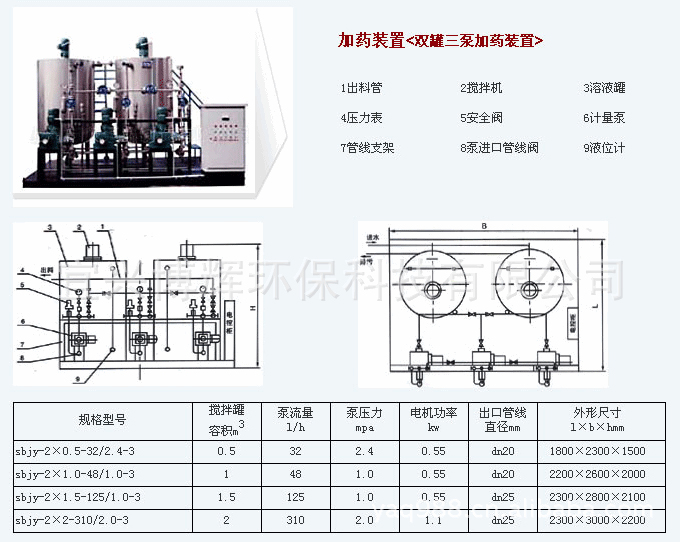 加藥裝置三種型號,都有三大部分組成:1. 攪拌機;2. 溶液槽;3. 計量裝置及投加設置。